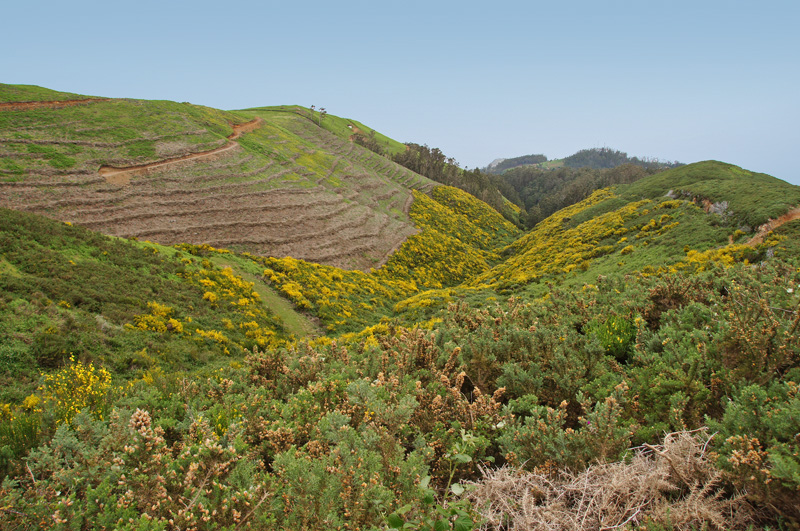 Die wellige Landschaft ist typisch für das Hochland Paul do Serra. Die Gegend ist überwiegend frei von Bäumen. Durch starke Winde haben es Bäume schwer, Wurzeln zu fassen. Niedrige Büsche haben es einfacher zu gedeihen. Insbesondere Ginsterbüsche sieht man im Frühjahr überall blühen.