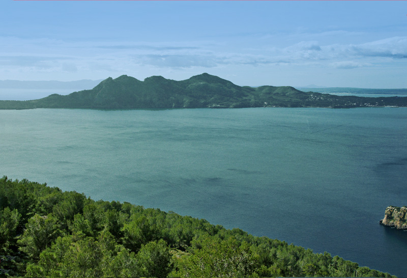 Im Osten reicht der Blick fast bis an das Ende der Halbinsel Formentor. Im Süden ist sogar die kleine Insel Illa de Formentor komplett zu sehen. Auch die touristischen Anlagen an der Platja de Formentor kann man erkennen.